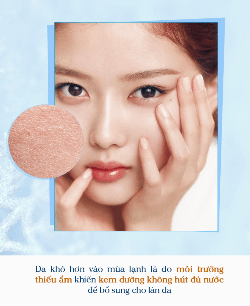 Khi thời tiết chuyển lạnh, độ ẩm trong không khí giảm mạnh khiến làn da mất nước nhanh hơn bình thường. Điều này dẫn đến da khô, bong tróc, nứt nẻ và lão hóa sớm.